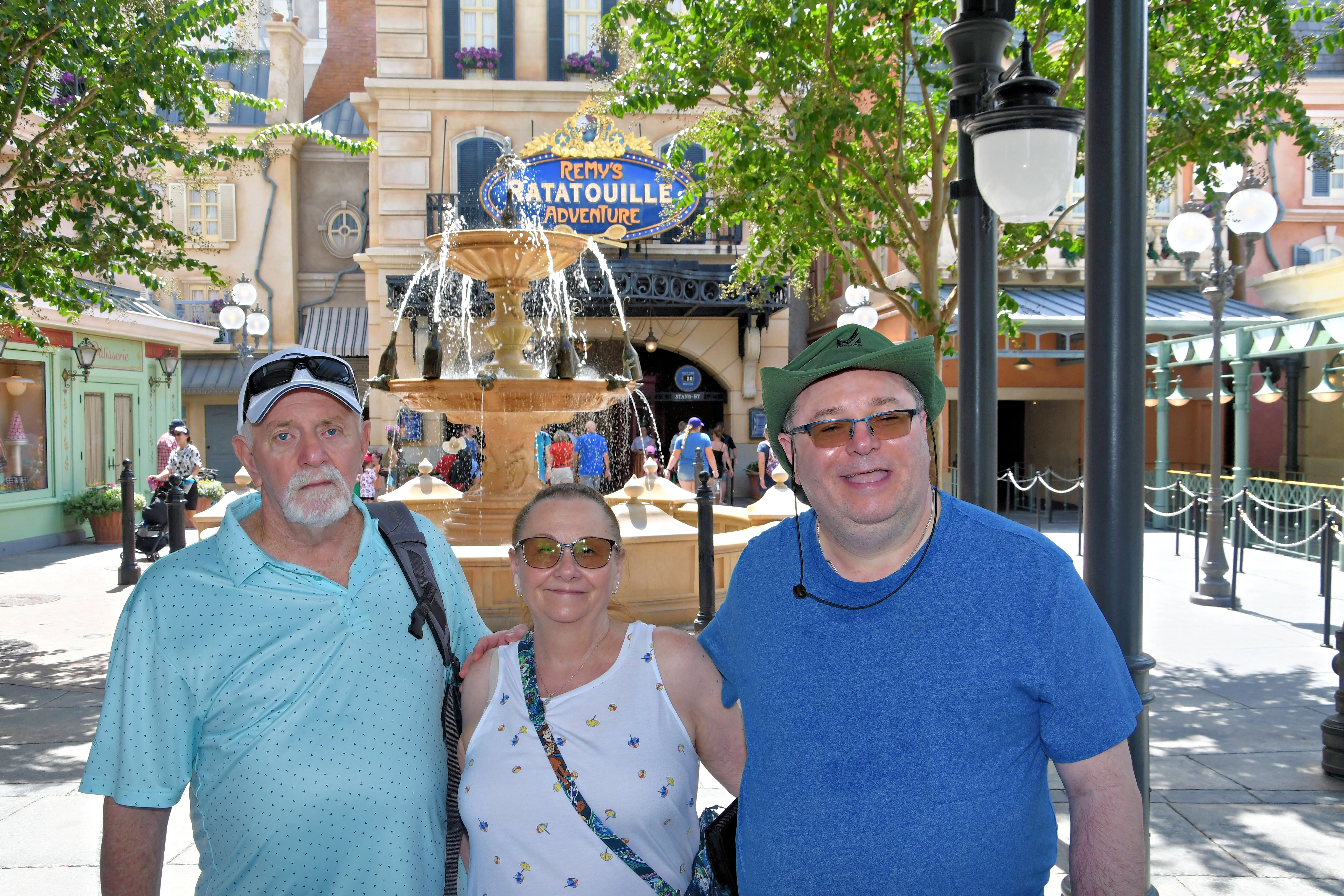 Three people in front of the France pavilion fountain at Epcot with Remy's Ratatouille Adventure behind them